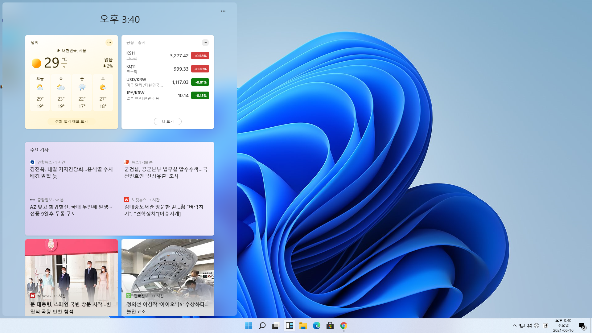 그나마 달라진거라 하면 윈도우10 최근업데이트로 추가된 작업표시줄 우측하단에 날씨가 뜨던것을 아실겁니다.