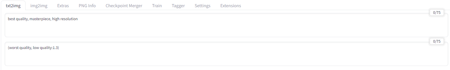 이 프로그램은 위쪽 입력칸은 "긍정" 프롬프트라고 해서 이 프롬프트에 써진 내용이 해당되는 이미지를 만들도록 조정합니다. 반대로 아래있는 프롬프트는 "부정"프롬프트라고 해서 이 프롬프트에 써진 내용이 해당되지 않도록 이미지를 조정합니다.